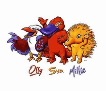 | 2000年澳大利亞雪梨夏季奧運會吉祥物Syd、Olly和Millie 2000年雪梨奧運會吉祥物Ollie,Syd和Millie 設計者:馬修 哈頓。吉祥物是三個澳洲本土動物,分別代表了土地、空氣和水。 Ollie代表了奧林匹克的博大精深(來自於奧林匹克);Syd表現了澳洲和澳洲人民的精神與活力(來自於雪梨);Millie是一個資訊領袖,在它的指尖上有資料和數據(來自千禧年) 。 | |