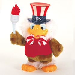 | 1984年美國洛杉磯夏季奧運會吉祥物Sam 名為 Sam的老鷹以美國星條旗為背景,紅白藍顏色更是美國的代表色,以卡通造形的鷹穿著代表美國傳奇人物「山姆大叔」的服裝。由迪斯尼所設計的吉祥物,十足的美國風味,吉祥物被商業化利用也從此次開始。 | |